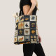 This autumn patchwork quilt-inspired tote bag features warm seasonal motifs arranged in rustic squares. Pumpkins, birds, hearts, and floral branches appear alongside plaid and checkerboard blocks, with stars, snowflake-like shapes, and baskets adding charming variety. Rendered in earthy tones of orange, brown, cream, red, and black, it captures the cozy farmhouse aesthetic of the harvest season. Perfect for Thanksgiving, rustic country décor, fall crafts, and anyone who loves primitive folk art style.