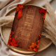 A warm and inviting design featuring a natural wooden background framed by vibrant autumn leaves and seasonal accents. The composition blends rustic textures with rich orange and red tones, creating a cozy and organic visual style. The natural elements and earthy palette evoke a timeless and charming atmosphere.
