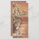 A rustic wedding program design featuring an image of a mason jar full of white baby's breath flowers on a wood background.