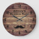 Barber Shop Large Clock with mustache image and customized business name on a rustic wood background color.