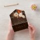 Romantic modern watercolor illustrations of fall floral bouquets in ivory and burnt orange, with roses and peonies, as well as greenery and dry grass, pampas grass and other boho foliage, over a rustic dark wood background, illuminated by gentle, stylized string lights, glittering emerald green background, decorate this rustic fall all in one wedding invitation with a boho floral greenery theme. An elegant, modern invitation for a rustic barn, farmhouse, country, lake house or backyard wedding, it is the perfect trifold wedding invitation that includes the RSVP card. Simply fold, seal and send. For brides who love the rustic barn aesthetic, the boho theme, burnt orange, rust and terracotta color schemes and dark wood grain backgrounds.