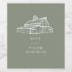 Wedding RSVP with barn illustration over Sage Green background.