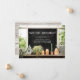 Announce your new home address to friends, family and associates with this charming rustic moving announcement flat card. It features a chalkboard with custom text that you can personalize with your new home address. The chalkboard sits above a potting shelf with houseplants, a birdhouse and clay pots along with a plant watering can. The look is rustic farmhouse style with a gardening theme. There is also a text template on the back of the card for personalizing with your desired message.