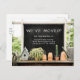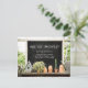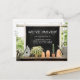 Announce your new home address to friends, family and associates with this charming rustic moving announcement post card. It features a chalkboard with custom text that you can personalize with your new home address. The chalkboard sits above a potting shelf with houseplants, a birdhouse and clay pots along with a plant watering can. The look is rustic farmhouse style with a gardening theme. There is also a text template on the back of the card for personalizing with your desired message.