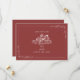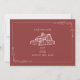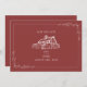 Illustration of rustic barn at top with line art botanical border. Background is muted red.