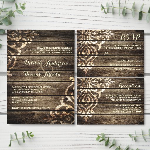 This rustic wedding program features a distressed barn wood look background with a faded white damask design burned into the wood. The perfect blend of rustic materials with the elegance of damask detailing. Perfect for your barn wedding, outdoor wedding, country wedding, rustic wedding, vintage wedding, or elegant wedding.