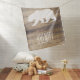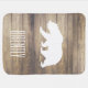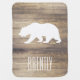Rustic light barn wood planks baby blanket featuring a crisp white bear silhouette and baby's name in white. This baby blanket fits well with a gender neutral or baby boy's adventure & woodland themed nursery!