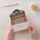All in one wedding invitation featuring pretty string lights, signature style names and chic typography on a rustic wood background. The invitation includes a perforated RSVP card with meal choice. Designed by Thisisnotme©