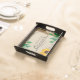 This is a well made, sturdy wooden tray with a flawless black finish and lovely map on the tray surface. It is both vintage & modern at the same time. Looks exactly like the photo; does not disappoint. So nice to find something of quality individually made and not the mass-produced 'shabby chic' merchandise seen in stores. I am so pleased to be able to give this to my college-age niece for her birthday. This can be used as a tray to hold jewelry or toiletries, or hung on the wall as art. The map surface is sealed (it is slightly shiny) so would be moisture resistant. It is well worth the asking price but I was able to apply a sale code as well. Very happy with my purchase. Map is crisp & clear and sealed with a water-resitant finish.