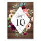 With rustic charm, this boho style wedding table number card has a rhombus diamond-shaped frame surrounded by watercolor peonies, roses, anemones, wildflowers and mixed greenery. The contrasting background is a rich brown barn wood pattern. The luscious color palette includes rich hues of pink, burgundy red, peach, off-white, green and teal. The floral design and table number info is on both the front and back of this card. To create individual table number cards for all your tables, edit the number on this card, then add to your shopping cart. Create another card by editing the number with your next table number, then add to cart. Do this for each table number card you require. This color scheme is a suitable choice for weddings in any season of the year and is particularly nice for fall, summer and winter weddings.
