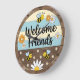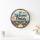 This charming round wall clock features a cozy, rustic design perfect for a farmhouse kitchen or entryway. The clock face is divided into a light blue and cream striped upper half and a weathered dark wood-grain lower half. Adorable cartoon honey bees with friendly smiles fly among scattered white and orange daisies across the entire surface. Centered in bold, black cursive script are the words "Welcome Friends," creating a warm and inviting atmosphere for any home. The perimeter is styled with a distressed wood-plank look and features simple numeric markers for easy timekeeping. This functional home accessory is an ideal housewarming gift or a seasonal spring decoration. Its blend of whimsical character art and classic rustic textures provides a cheerful and welcoming focal point for your interior living space.