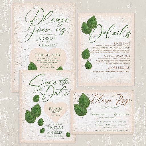 Celebrate your love story with this elegant rustic wedding paper coaster featuring a beautifully textured birch bark background with a softly carved heart detail, adorned with rich green foliage. The sweeping calligraphy script paired with classic serif text creates a timeless yet seasonal feel, perfect for any spring or summer woodland wedding.