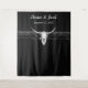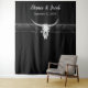Rustic wedding, country western black and white bull cow skull cowboy dinner reception photo booth backdrop. Customized farmhouse style. Old wild west vintage antique inspired for the bride and groom. Cool, trendy, modern farm animal design marriage prop. Customize your typography. Image copyright Marg Seregelyi Photography.