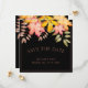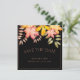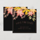 Rustic Black Autumn Leaves Save the Date Card. This moody save the date card features falling autumn leaves in golden, blush, and amber tones on a deep black background. A perfect way to announce your fall wedding with rustic elegance and seasonal charm.