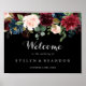 This rustic black botanical wedding welcome sign is perfect for a classic wedding. The design features burgundy, red, navy, blue and blush radiant and graceful hand-painted flowers in a black background, inspiring natural beauty.