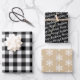 Rustic modern gift wrap set features three coordinating holiday wrapping paper sheets: black and white buffalo plaid, black with white script "Merry Christmas" text, and kraft tan brown with white winter snowflakes pattern.