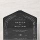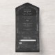 All in one tri- fold boho wedding invitation featuring a rustic black chalkbaoard with a hand drawn arch frame. Wedding invitation, rsvp card and envelope combination.