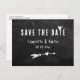 Custom rustic chalkboard wedding save the date postcards featuring wedding details, heart and arrow on a black chalkboard background.
