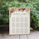 Wedding guest seating chart features your names in elegant calligraphy script script lettering, with your wedding date and guest table assignments beneath. Space provided for up to 12 tables. Designed to mach our Rustic Bloom wedding and event collection, with watercolor florals and foliage in muted autumn earth tones.