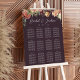 Wedding guest seating chart features your names in elegant calligraphy script script lettering, with your wedding date and guest table assignments beneath. Space provided for up to 12 tables. Designed to mach our Rustic Bloom wedding and event collection, with watercolor florals and foliage in muted autumn earth tones.