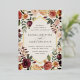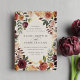 A showstopper in rich earth tones, this elegant floral wedding invitation or fall or winter weddings features your details nestled inside an elongated gold foil hexagon surrounded by watercolor roses, mums and greenery in rustic autumn colors including peach, ivory, blush, burgundy and green.