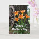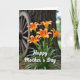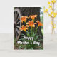 On the front of the card a cluster of six open blossoms spreads across the center and right side, with petals glowing in orange and deep golden tones like a warm hug ❤️. Their tiny stamens stand out crisply, while the background fades softly to keep the focus on the flowers and the gentle closeness they suggest. A tall, dark tree trunk rises behind them with rough, ridged bark, adding a steady, protective feel like someone quietly standing by a loved one. Off to the left, a weathered wooden wheel appears slightly out of focus, hinting at a calm, rustic outdoor setting. Soft, diffused daylight falls across the petals and green leaves, giving everything a tender, affectionate glow without harsh shadows. Along the lower foreground, the words “Happy Mother’s Day” sit in white lettering, centered and easy to read against the darker greens and browns 🌼. The orange-and-gold blossoms dominate the scene, framed by deep bark texture and the faint curve of the wheel at the left edge.