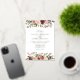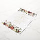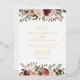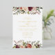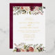Elegant floral wedding invitations or fall or winter weddings feature your details in luxe gold foil lettering accented by top and bottom borders of watercolor roses, mums and greenery in rustic autumn colors including peach, ivory, blush, burgundy and green. Cards reverse to a subtly mottled deep cabernet.