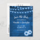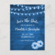 Blue tone rustic save the wedding date cards feature wood photo background with sparkling string of lights and flower daisies. Mix and match this wedding save the date with our collection of matching wedding stationery and favors.