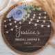 Rustic dark brown wood bridal shower paper plates with periwinkle blue watercolor floral and glittering string lights, customized with the bride's names and shower date. Contact us for help with customization or matching products.