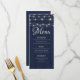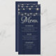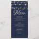 Introducing our captivating rustic wedding menu, featuring twinkling string lights against a dark navy wood effect backdrop. Perfect for a rustic barn-themed celebration, this menu is easy to customise.