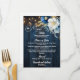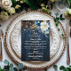 An elegant Wedding design with elegant calligraphy completed by wonderful blue wood, garden string lights and white blue floral with gold glitter. You can personalize this with your Wedding menu.