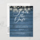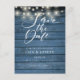 This rustic save the date card features string lights and an elegant script save the date above your details set in elegant typography on a blue rustic wood panels background. The reverse has additional save the date details, including your wedding website, with your return address and space for your recipient's address. Designed by Thisisnotme©