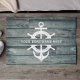 Nautical boating doormat on printed grey turquoise driftwood reading your custom boat name surrounded by a ship's well and anchor.