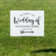 Greet guests with this fun and casual wedding welcome yard sign display featuring bold hand-lettered brush calligraphy and a charming hand-drawn arrow accent on a clean white background. The relaxed, modern typography and whimsical arrow detail create a laid-back bohemian vibe perfect for outdoor, barn, or rustic celebrations. The couple's names and wedding date are prominently displayed in a simple, eye-catching layout. All text is fully customizable.