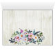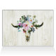 Rustic bohemian floral wreath and longhorn cow skull over white-washed wood planks background thank you card.