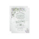 These beautiful wedding invitations feature a rustic boho chic design with hand painted watercolor eucalyptus leaves and sprigs of lavender & garden greenery on a marbled dusty blue background. The lettering is done in both sage green and black and the typography features fancy script calligraphy. The back has a details section with space for extra information about hotel, reception, registry, directions, rsvp or whatever extra info your guests may require along with a customizable QR code directing them to your website.