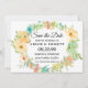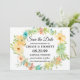 Very pretty watercolor flowers create colorful Save the Date card. A large wreath on the front frames the wedding info. An elegant sprig decorates the back which is soft green. Wildflowers are soft yellow, bright turquoise blue, and pretty peach pink. All kinds of leaves and dangles give it its Boho vibe. You can easily change all of the text. This item is part of the Rustic Boho Wildflowers collection. You should see a link to it on this page. If you don't please contact me.