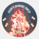 This fun bonfire birthday party stickers is great for any type of bonfire party to use on any party favors. The design features a blazing bonfire and sticks that are piercing marshmallows over a warm fire. The background is forest, with a blue sky and twinkle lights above. It's great for camping or a rustic outdoors party.