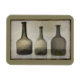 Rustic, still life art with 3 antique bottles in muted tones of green and brown.