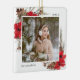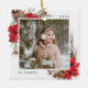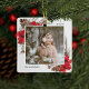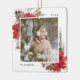 A beautiful rustic chic Christmas photo ornament featuring your favorite square photos (one on each side) surrounded by a thin white border with painted watercolor branches, boughs, red flowers and pine cones peeking out at the corners. Personalize with the year and your family name.