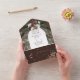 AVAILABLE WITH OR WITHOUT A QR CODE TO SCAN. This design features a rustic green pine and pinecone bouquet on a soft cocoa brown background with white flowers. It is accented with a white sparkle overlay to illustrate the magic of the beautiful winter holidays. Perfect for a Christmas or winter wedding. Personalized All-In-One invitations are a unique combination of both a beautifully printed custom invitation with an easy to tear off perforated RSVP postcard. And they are so easy to use! You simply fold, then seal the back flap with the three included clear stickers, and mail. And when your guests receive your custom invite, they just tear the perforated RSVP Card off and drop it back in the mail to you!