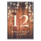 Rustic table card with a wood background featuring string lights. The font colors and font styles on the table card design are all fully customizable.