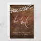 This sophisticated but rustic card is perfect for a casual or country-themed wedding. With rich brown wooden background and overlapping strings of twinkling white light accents, I've used an elaborate script font to render a graphic depicting the words "love and thanks". Your personal details are easily added for customizing this template as little or much as you wish. Use the template fields to enter your personal details, and click to customize further if you'd like to re-position any of the unlocked players.