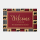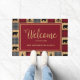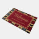 Rustic "welcome" door mat with a patchwork of red and black buffalo check alternating with patches of a wood plank design. Bears and pine trees are mixed into the pattern. Personalize with "Welcome" and your family name, or any text you choose. Perfect for your mountain home.