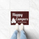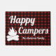 Cute family "Happy Campers" doormat featuring a bold buffalo check plaid red and black pattern and white campfire silhouette.