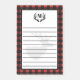 Rustic red and black buffalo check plaid notepad with monogram letter framed by deer antlers. The lined area features a deer head silhouette watermark.