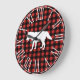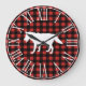 Rustic red and black plaid clock with white numerals and white wolf silhouette.