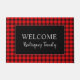 Modern rustic red black buffalo plaid welcome family name Doormat.