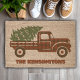 Rustic Buffalo Plaid Christmas Truck Holiday Fiber Doormat. Vintage truck and tree on a rustic tan background. Easy to customize; plenty of space for your custom text.