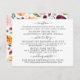 Wedding information cards include reception, accommodations for two hotels, and wedding website information. The back of the card features a floral pattern of beautiful watercolor flowers, including roses, dahlias, peony flowers, and greenery, in a gorgeous autumn palette of burgundy red, golden yellow, peach orange, blush pink, and shades of green.